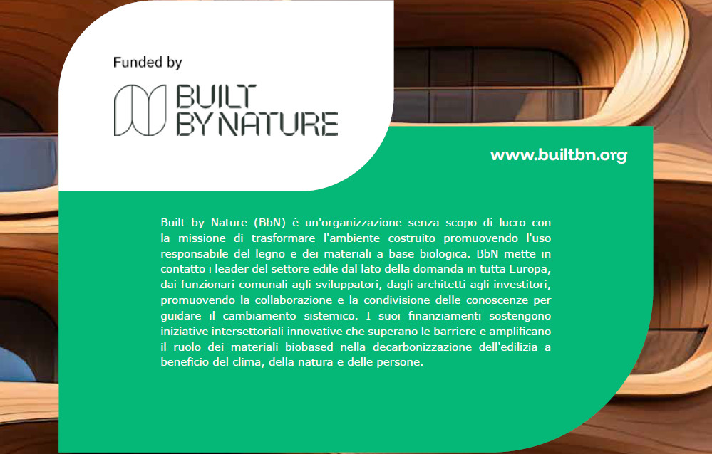 Il report nasce all’interno del progetto Timber Forward Italia, coordinato da GBC Italia e finanziato da Built by Nature, con l’obiettivo di promuovere l’utilizzo del legno e dei materiali bio-based come leva per la decarbonizzazione del costruito . La pubblicazione raccoglie oltre 40 progetti selezionati per innovazione, qualità e coerenza nell’uso del legno.