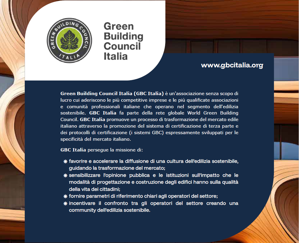 GBC Italia è un’associazione no-profit che riunisce aziende, professionisti e istituzioni impegnati nello sviluppo dell’edilizia sostenibile. Parte della rete internazionale World Green Building Council, l’organizzazione ha l’obiettivo di trasformare il mercato delle costruzioni attraverso protocolli di certificazione, diffusione della cultura green e collaborazione tra stakeholder del settore.