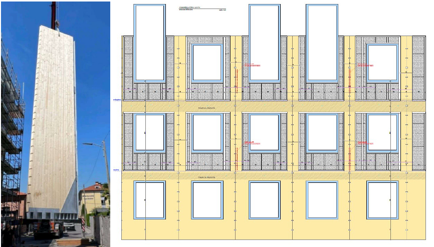 Avendo il fabbricato due interpiani e una copertura, e presentando aperture di 1,5×1,5 m circa, si è adottato uno schema modulare con pannelli verticali in CLT di larghezza massima 3,0 m e altezza fino a 13,0 m, ciascuno dimensionato per inglobare il foro serramento. Gli spessori sono differenziati: