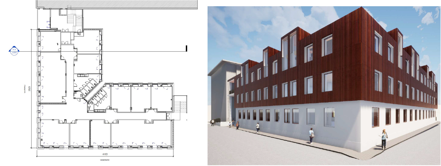 Alla luce di tali premesse, è stato sviluppato un progetto di adeguamento sismico innovativo mediante l’adozione di un esoscheletro esterno in CLT, soluzione capace di integrare miglioramento strutturale, efficientamento energetico e rinnovamento architettonico in un approccio unitario e sostenibile (figura 3).