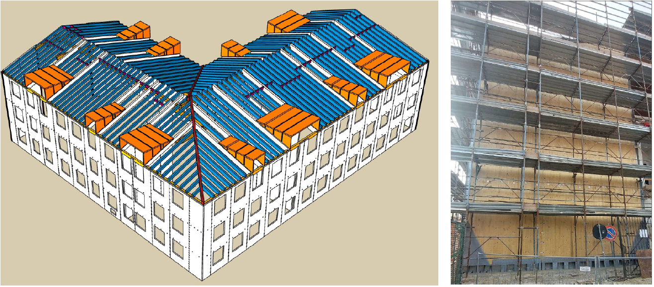 Le prime applicazioni di esoscheletri per il rinforzo sismico risalgono agli anni ’80 e si sono prevalentemente sviluppate con sistemi metallici esterni 2D (pareti di taglio addossate) o 3D (telai/nuclei), collegati alla struttura principale per incrementarne rigidezza, resistenza e, in taluni casi, capacità dissipativa. La letteratura recente descrive un’evoluzione verso soluzioni additive, reversibili e a basso impatto, in grado di combinare prestazioni sismiche con riqualificazione energetica e riordino architettonico dell’involucro. In tale ambito si collocano anche proposte con ossatura metallica dissipativa, telai e facciate prefabbricate in legno [1-2] e, più recentemente, esoscheletri in CLT come alternativa sostenibile alle soluzioni in acciaio [3-5]. L’impiego di materiali come il Cross-Laminated Timber (CLT) come “pelle strutturale” esterna consente infatti di realizzare pareti di taglio leggere, ad elevata resistenza e rigidezza nel piano, fortemente prefabbricate, integrabili con strati termoisolanti e rivestimenti, e capaci di ridurre drasticamente l’invasività all’interno degli edifici esistenti (figura 4). Studi applicativi evidenziano come tale soluzione possa fornire una risposta integrata (sismica, energetica ed architettonica) accompagnata da benefici ambientali e rapidità di cantiere (figura 5).