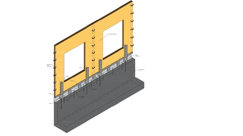 La trasmissione delle forze di taglio di piano avviene dal solaio in latero-cemento alle pareti di taglio in CLT tramite collegamenti puntuali diffusi tra la trave perimetrale in c.a. del solaio esistente e i pannelli in CLT. Il trasferimento a terra è demandato a una trave metallica a “C” interposta tra i pannelli e le nuove fondazioni in c.a. ad anello. Le connessioni verticali a trazione sono state realizzate mediante hold-down alle estremità delle pareti e, per i setti maggiormente sollecitati, mediante integrazione con un pilastro metallico HEA 200 solidale al bordo del pannello, finalizzato a distribuire le forze di sollevamento lungo tutto il bordo libero del pannello in CLT.