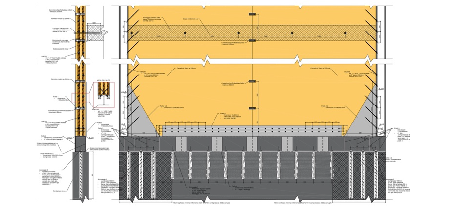 I setti in CLT, tramite le suddette travi metalliche a “C”, sono appoggiati a una trave di fondazione in c.a. ad “L” di nuova realizzazione, adiacenti alle fondazioni esistenti, poggianti su micropali in corrispondenza dei setti maggiormente sollecitati (caratterizzati da elevati uplift e sforzi di taglio).