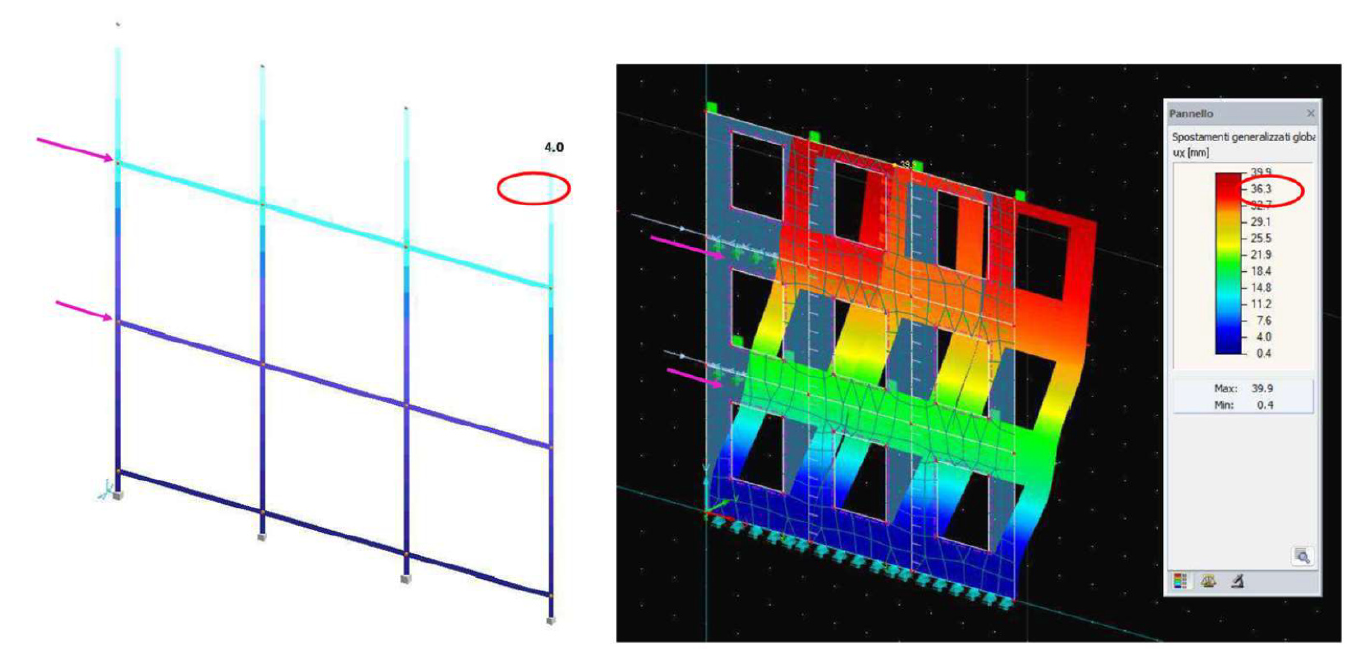 La rigidezza risultante (in piano) è stata poi “condensata” nel modello globale a telaio equivalente (maschi+fasce) mediante un processo iterativo (match curva forza-spostamento), al fine di ottenere i reali spostamenti della struttura.