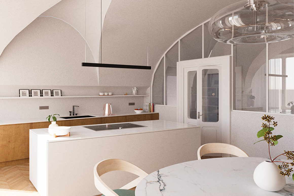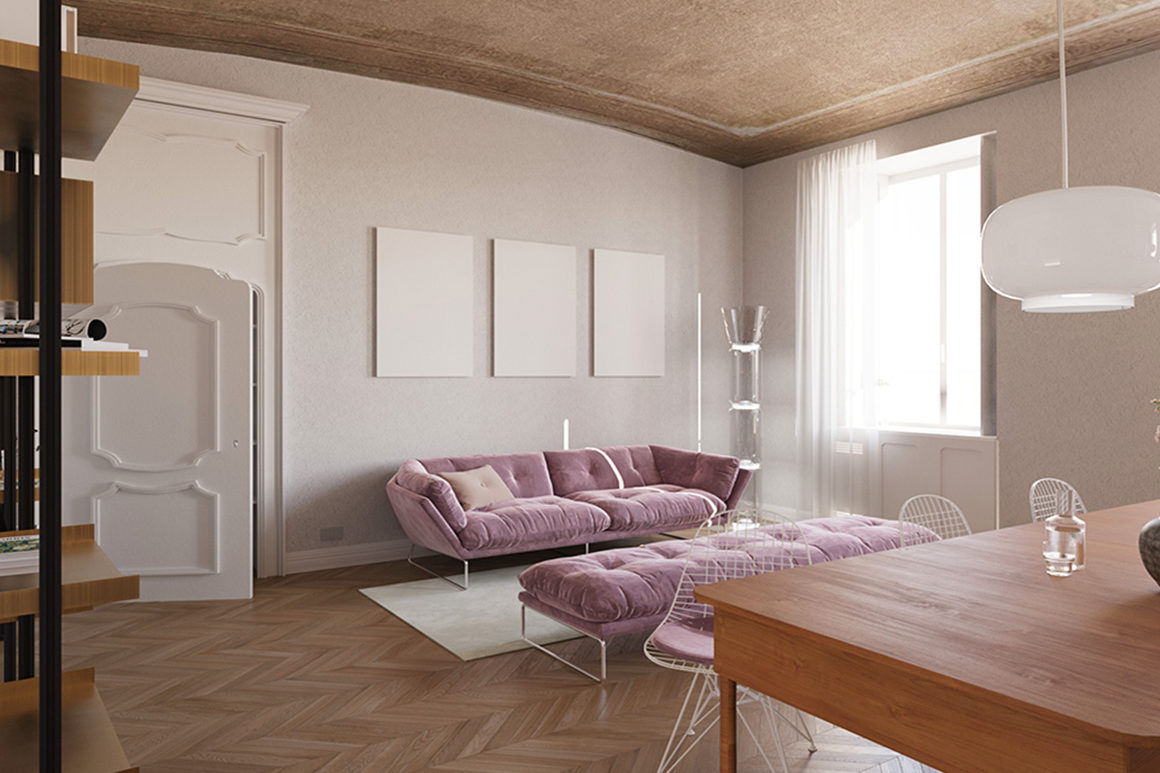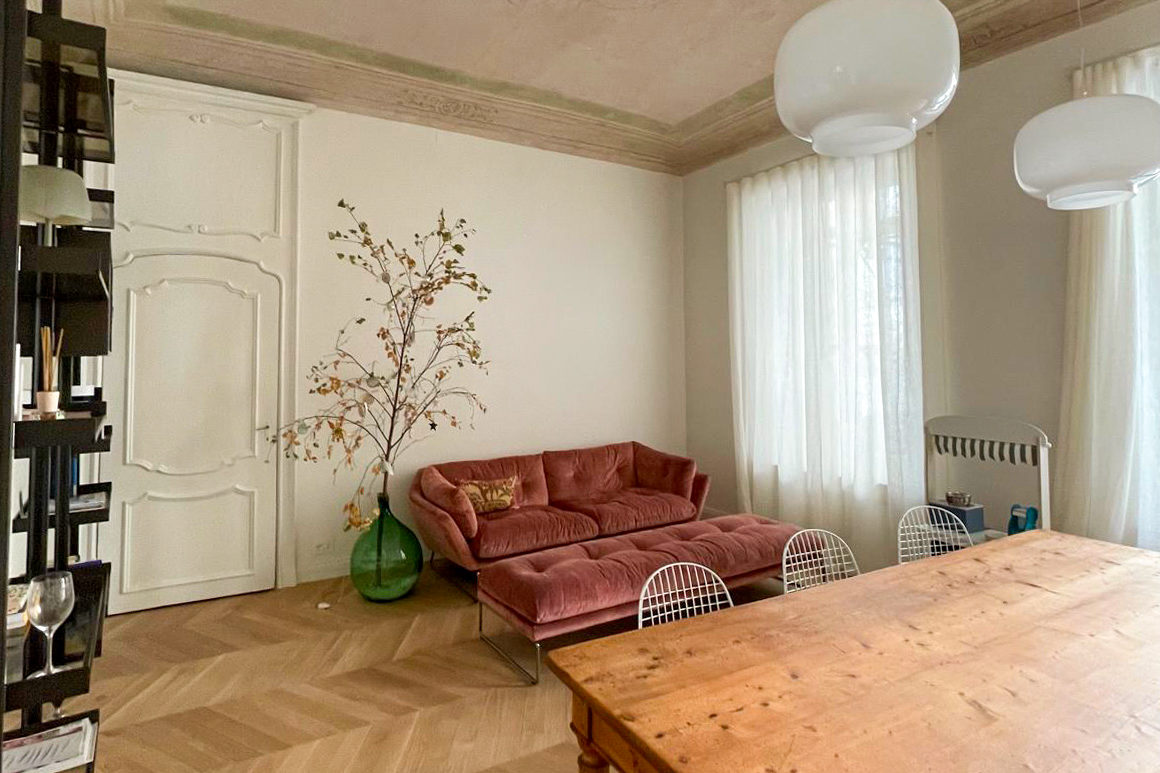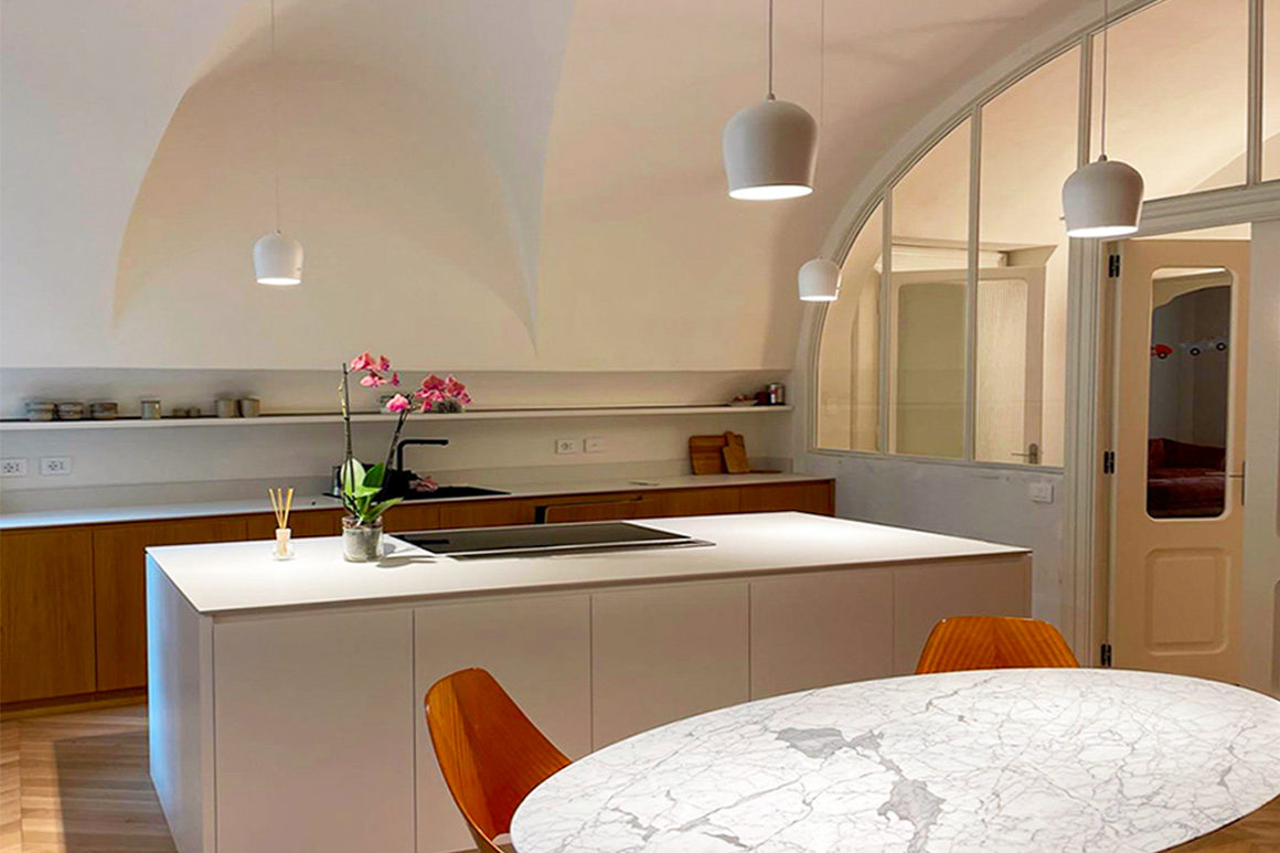 La disposizione degli ambienti è stata studiata in modo da integrarsi armoniosamente con questi elementi, creando un equilibrio tra antico e moderno. Una grande vetrata centinata separa un ampio ingresso dalla zona pranzo e permette una visione continua della volta. Da qui si può accedere ad un luminoso soggiorno caratterizzato da arredi essenziali, ampie finestre e delicati affreschi a soffitto. Adiacente a quest’ultimo ambiente troviamo una camera master. Da qui, sulla sinistra troviamo un bagno con vasca su misura. Attraversando la zona pranzo caratterizzata da arredi disegnati su misura, accediamo tramite un corridoio illuminato naturalmente, al secondo bagno e alla camera bimbi caratterizzata da un’illustrazione disegnata dalla committenza stessa. Ricerca di materiali e di colori sono stati il perno sul quale si è sviluppato il progetto di ristrutturazione. Seminato alla veneziana e rovere posato a spina ungherese caratterizzano la pavimentazione. Il progetto di ristrutturazione dell’alloggio si è concluso con successo, ottenendo un risultato di ambienti che combinano armoniosamente funzionalità e rispetto per la storia preservando l’anima storica dell’edificio, offrendo al contempo un comfort abitativo moderno.