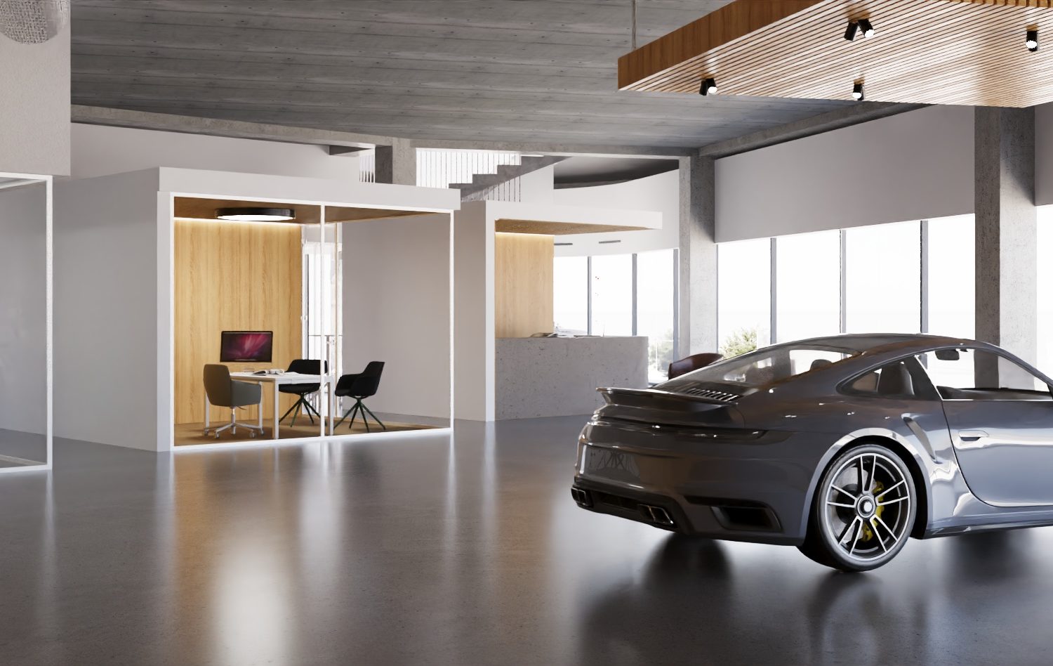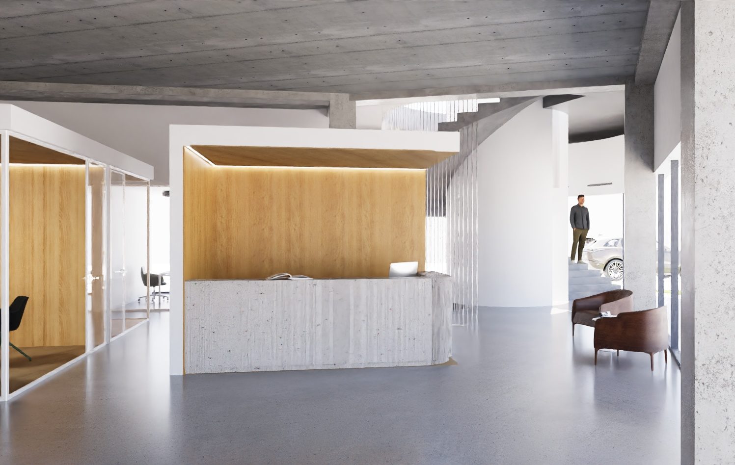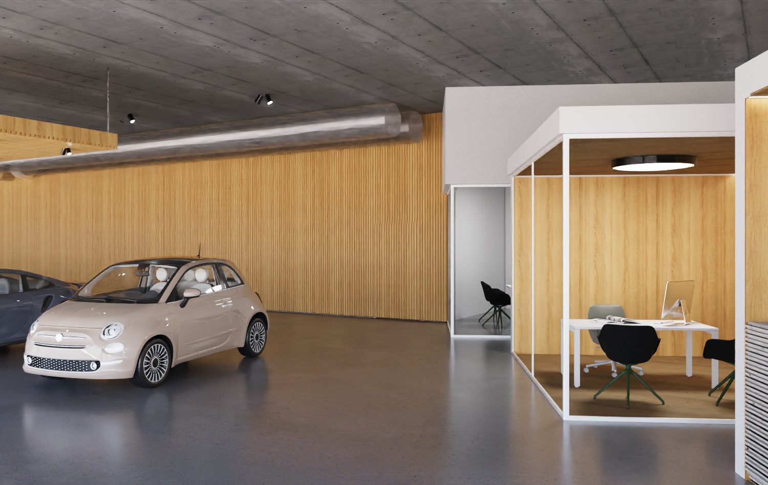 Il progetto prevede la realizzazione di un edificio moderno e funzionale destinato a ospitare una concessionaria con officina e servizi di assistenza, sviluppato su due livelli: un piano terra e un piano interrato. Quest’ultimo, grazie a un’attenta modellazione del terreno con una scarpata, rimane parzialmente visibile sul fronte principale e beneficia di luce naturale attraverso una grande vetrata, creando un vero e proprio spazio espositivo anche al livello inferiore. Il piano terra si caratterizza per un’altezza interna generosa di 4,50 metri e per le grandi vetrate panoramiche sui fronti principali, che rendono l’edificio trasparente, luminoso e fortemente riconoscibile dalla strada. La copertura è piana e carrabile, pensata per ospitare un’esposizione esterna di veicoli, ed è completata da pensiline metalliche che sostengono l’impianto fotovoltaico e proteggono le auto con sistemi antigrandine. Una scala di sicurezza esterna garantisce l’accesso e l’esodo in piena sicurezza. Dal punto di vista architettonico, l’edificio si ispira a un linguaggio minimale ed essenziale, con volumi compatti e forme semplici, studiati non solo per un forte impatto estetico ma anche per favorire l’efficienza energetica. Un elegante aggetto continuo lungo le facciate principali crea un percorso coperto davanti alle vetrate, bilanciando la solidità delle superfici opache con la leggerezza del vetro. All’interno, la concessionaria si sviluppa attorno a una grande area espositiva a tutta altezza di circa 500 mq, affiancata da una zona servizi con uffici, reception, spazi di attesa e sale riunioni. Al piano interrato si trovano i locali tecnici e di servizio oltre ad un rimessaggio-vetrina per le auto, visibile anche dall’esterno. L’officina e il car service occupano invece la parte retrostante del piano terra, con accessi carrabili dedicati e spazi attrezzati per l’assistenza e l’autolavaggio. Grande attenzione è stata dedicata all’accessibilità: tutti gli spazi aperti al pubblico, inclusa la copertura, sono fruibili anche da persone con disabilità, grazie alla presenza di ascensori e percorsi senza barriere. Un progetto che unisce funzionalità, immagine contemporanea e qualità degli spazi, pensato per offrire un’esperienza accogliente, efficiente e all’altezza degli standard più moderni.