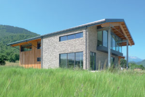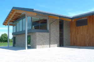 L’aspetto esterno dell’edificio è caratterizzato dall’uso di materiali naturali, scelti per integrarsi armoniosamente con il contesto montano e creare un design semplice e funzionale. Il blocco destinato a vendita e uffici è rivestito in pietra a spacco naturale, mentre la parte produttiva presenta un rivestimento in legno di larice scuro.