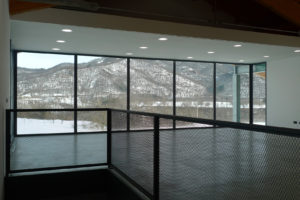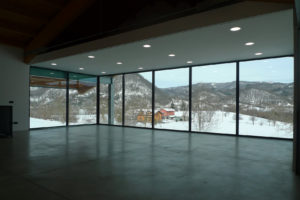 La copertura dell’edificio è realizzata in legno lamellare con capriate e arcarecci, sorretta da travature in acciaio, per garantire stabilità e leggerezza. Le facciate sono dotate di ampie vetrate che permettono alla luce naturale di penetrare negli spazi interni, favorendo un’ulteriore connessione visiva e percettiva con il paesaggio della valle. L’edificio, quindi, si presenta come un esempio di architettura che rispetta e valorizza l’ambiente naturale, con soluzioni progettuali orientate alla sostenibilità e all’efficienza funzionale.